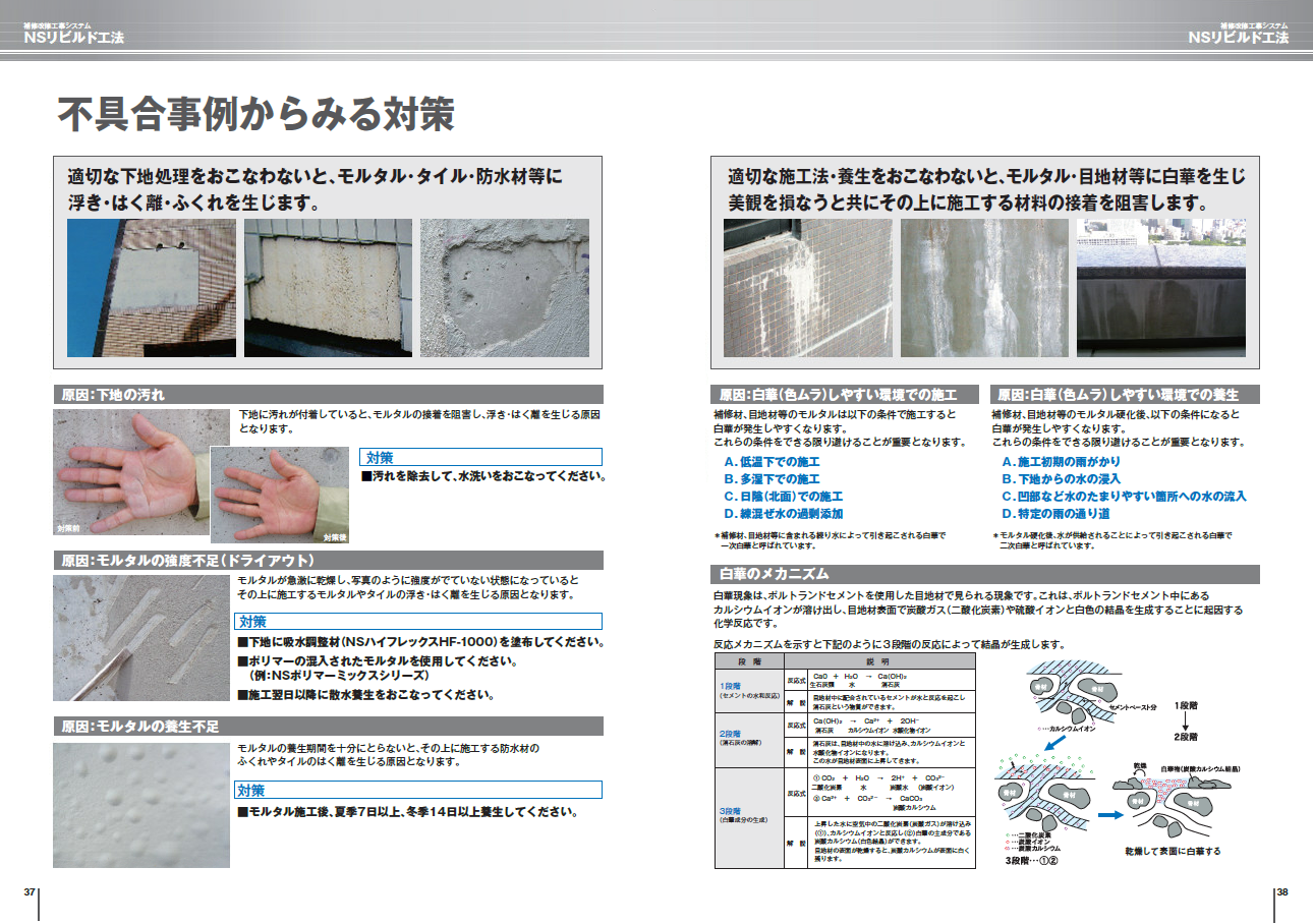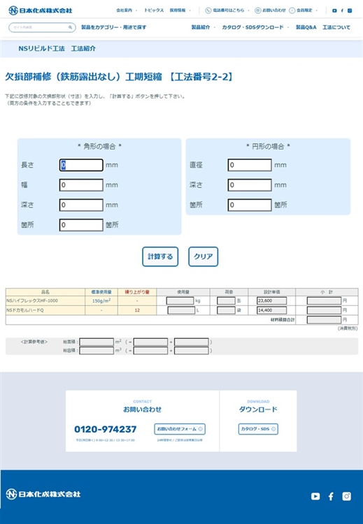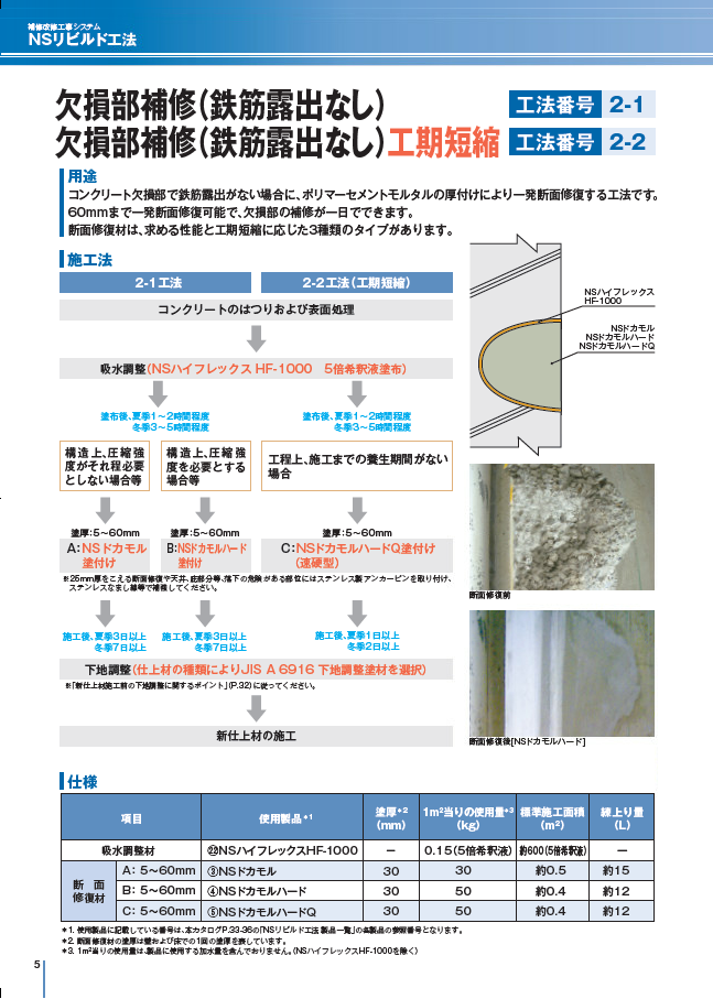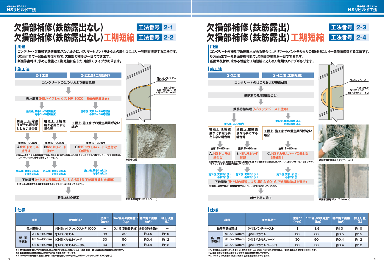 荷姿や標準施工面積の記載もある、NSリビルド工法内で使用する日本化成製品の一覧ページ