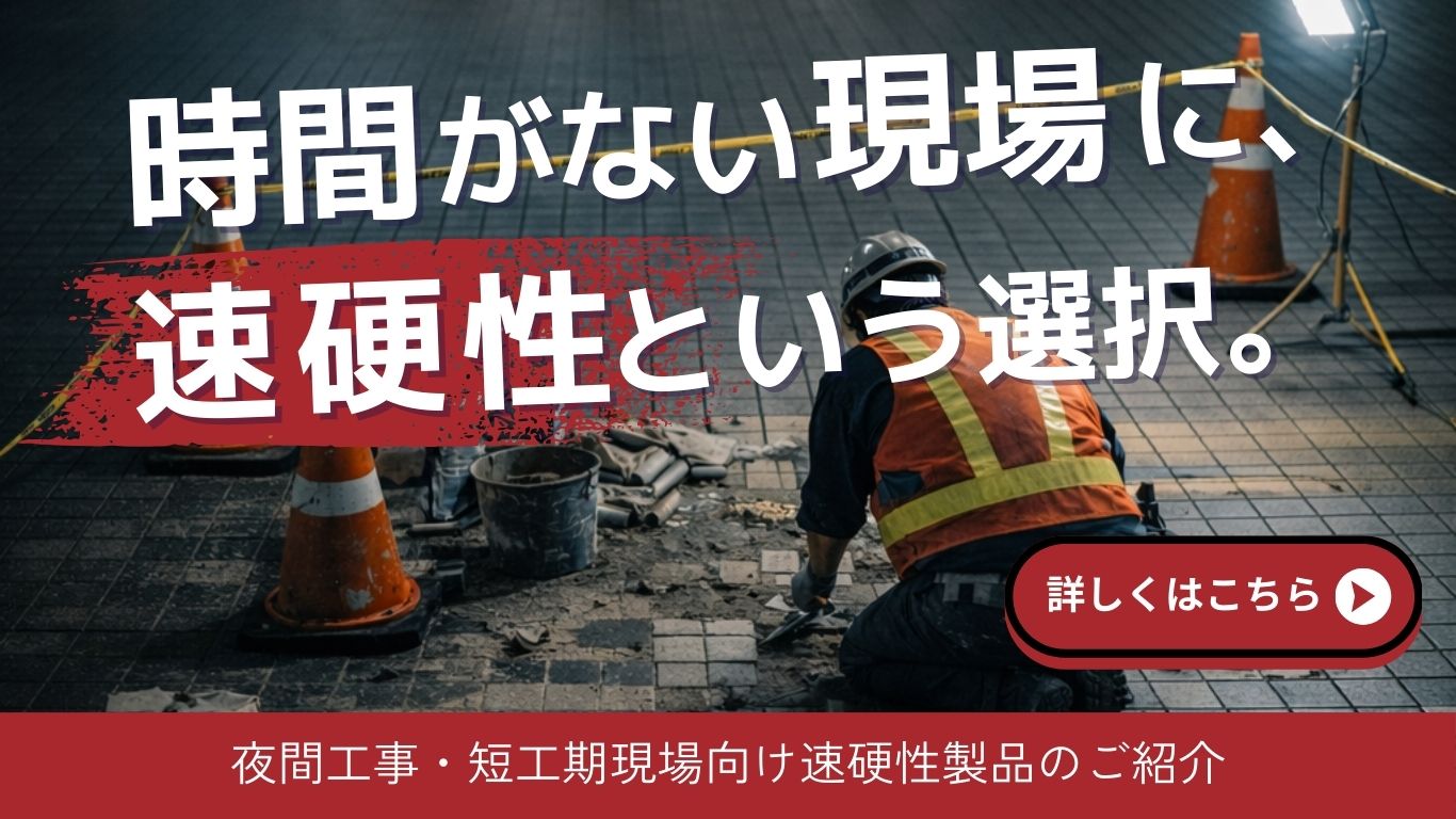 2026.01.19 施工情報 時間制約のある現場向けー速硬性製品紹介ページを公開しました 夜間工事や短工期工事など、施工時間に制約のある現場向けに、 速硬性製品をまとめて紹介する特集ページを公開しました。 本ページでは、 速硬性能を持つ「NSカチオンワンQ」「NSドカモルハードQ」について、 それぞれの特長や使い分け、施工事例を分かりやすく整理しています。 養生や硬化待ちによる工程ロスを抑えたい現場や、 限られた作業時間でも確実な施工が求められるケースにおいて、 材料選定の参考としてご活用いただける内容です。 ぜひこちらからご覧ください↓